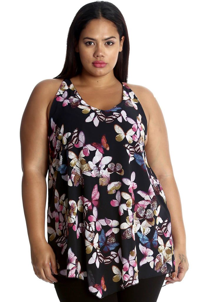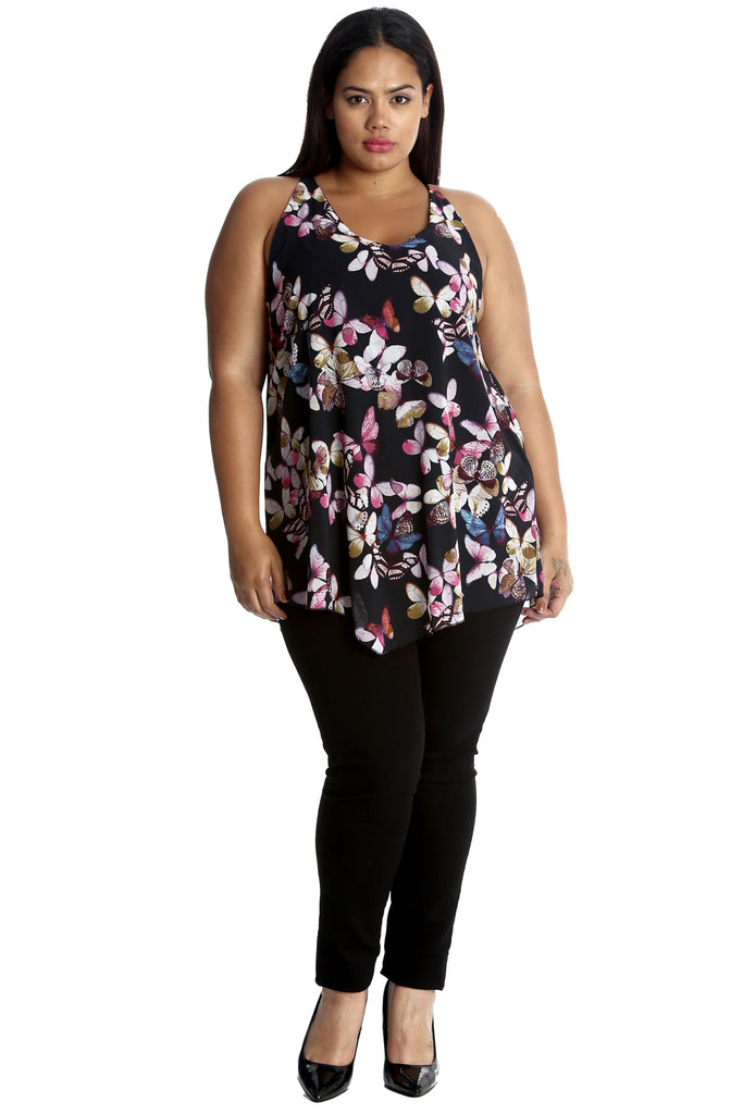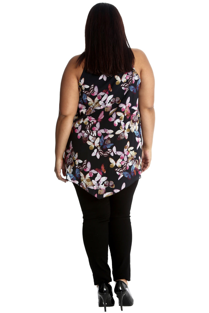 With its delicate chiffon fabric, the top flows effortlessly over your curves, offering comfort without compromising on grace. The dreamy butterfly and floral print adds a joyful splash of colour, while the flattering hanky hem creates movement that mirrors your energy and confidence.
