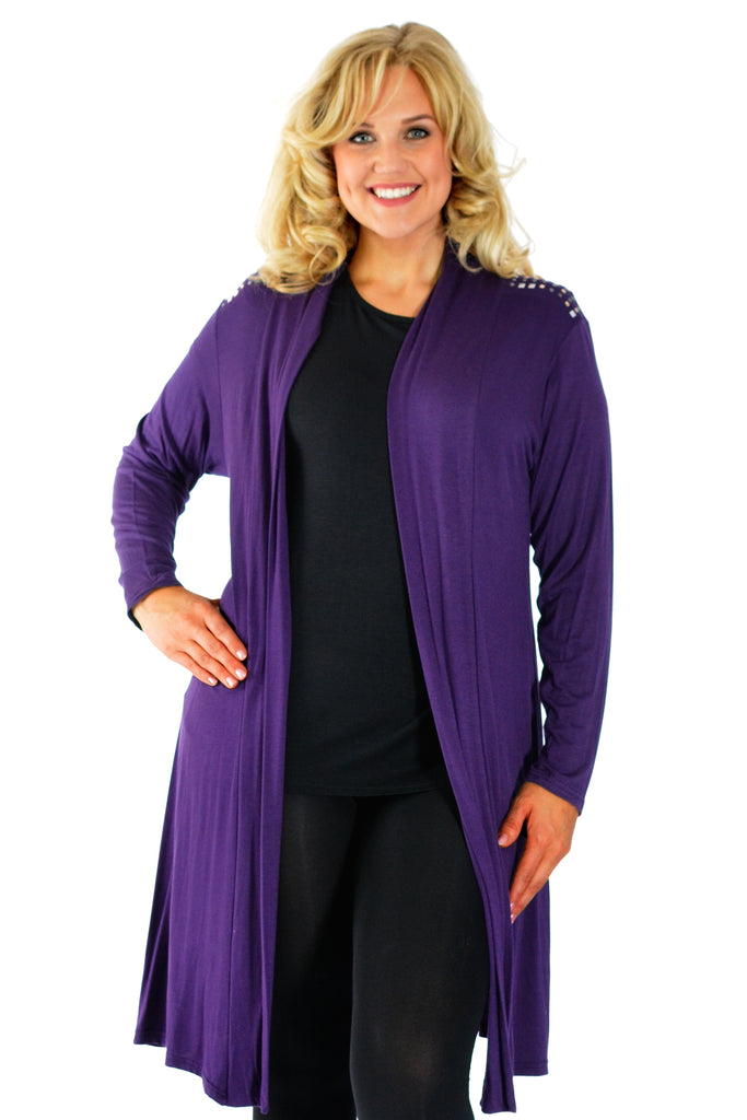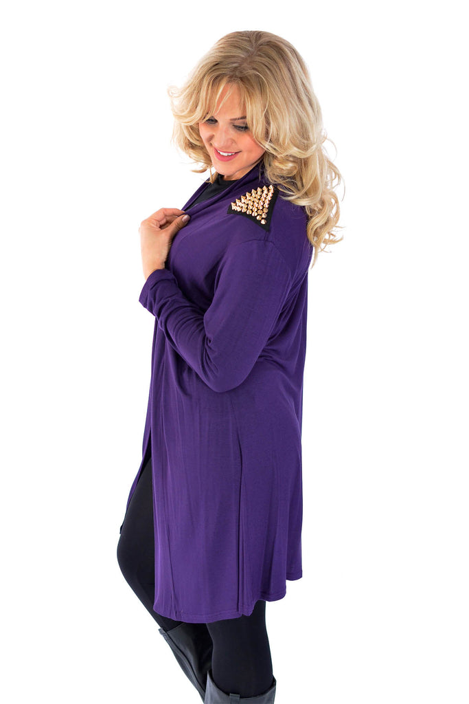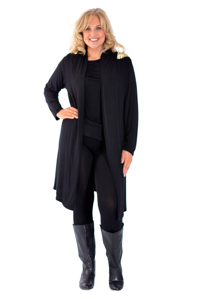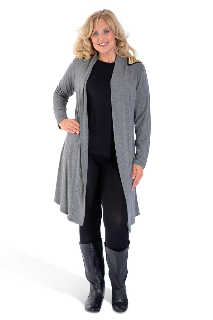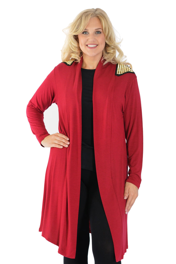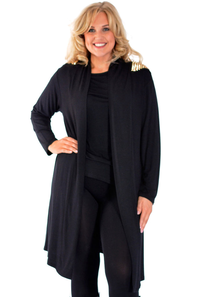 Command the spotlight with quiet strength. This open military-style cardigan features bold stud detailing that brings fierce femininity to life effortless, striking, and unapologetically strong. Its open front design layers beautifully over your curves, creating movement and presence with every step. Whether you’re elevating a casual look or making a statement at dinner, this piece speaks volumes without saying a word.