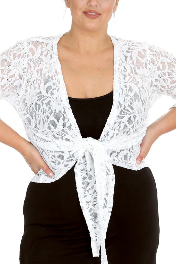 Crafted in delicate lace with dazzling sequin accents, this shrug adds a soft, feminine touch to any outfit. Its open-front design makes it effortlessly versatile, perfect over dresses, tanks, or eveningwear when you want just the right amount of sparkle.