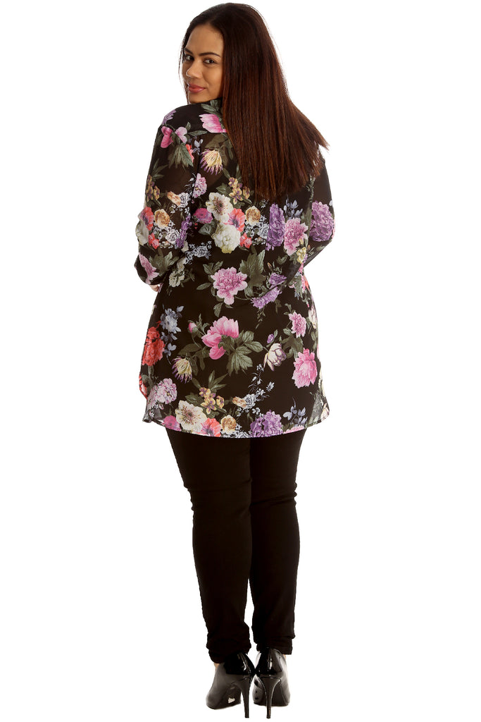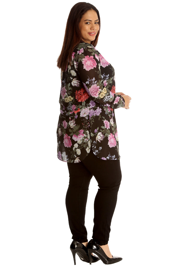 1476 Floral Chiffon Shirt with Ban Collar Detail
