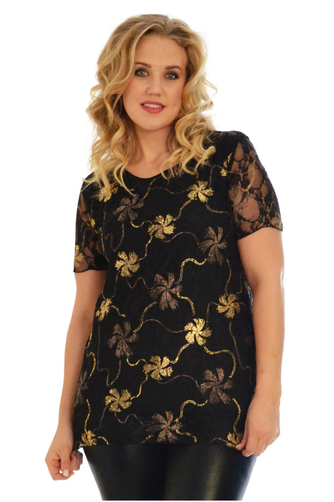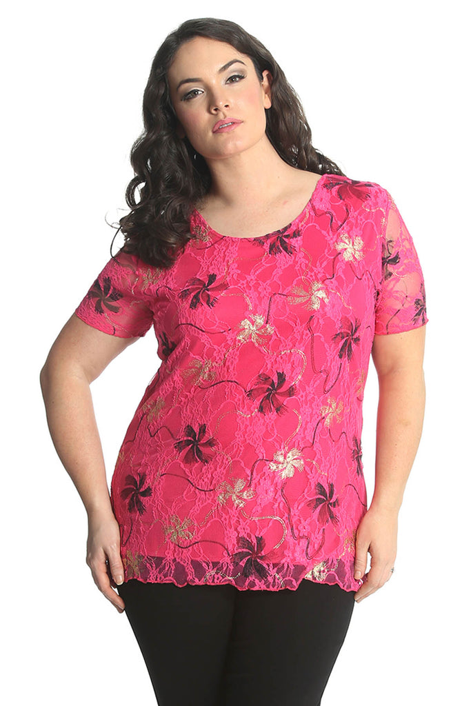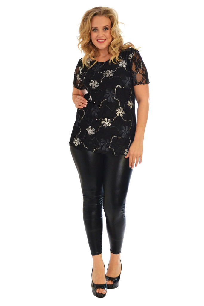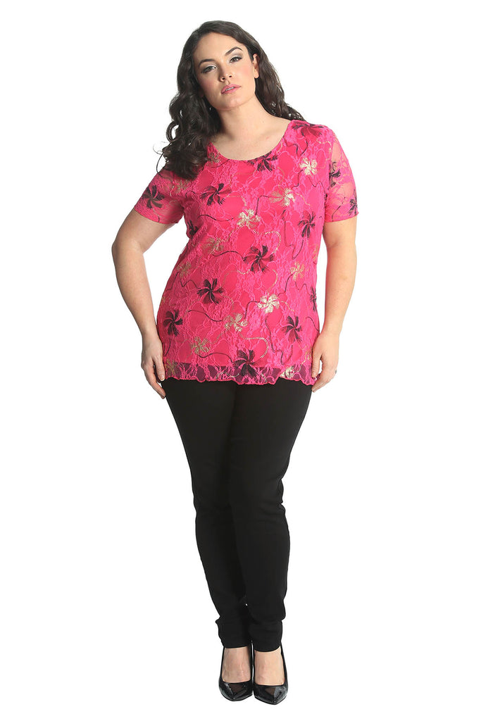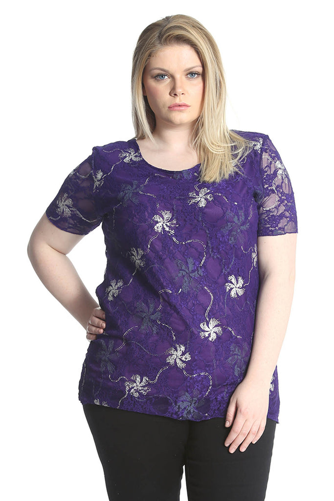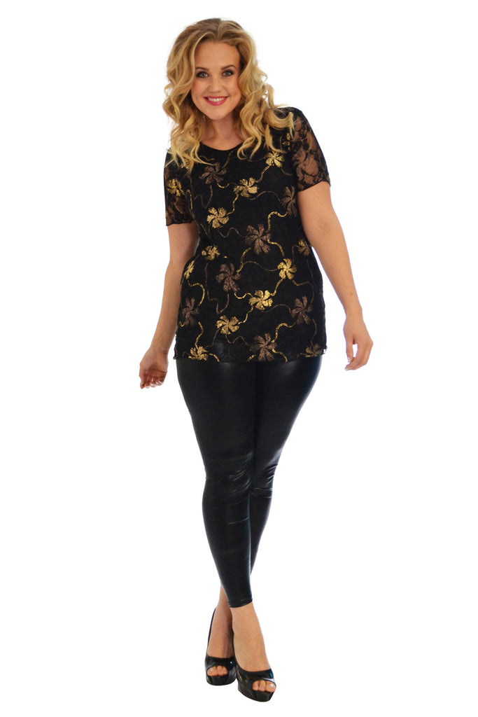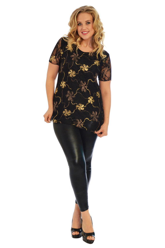 A Gorgeous lace lined floral tunic, featuring a floral foil print design. The item has short sleeves and a elegant round neck. This item can be worn with wet look leggings and High heels, The look is very fashionable giving you a sexy edge appeal. Model Wears/Height: 5.9ft size 16