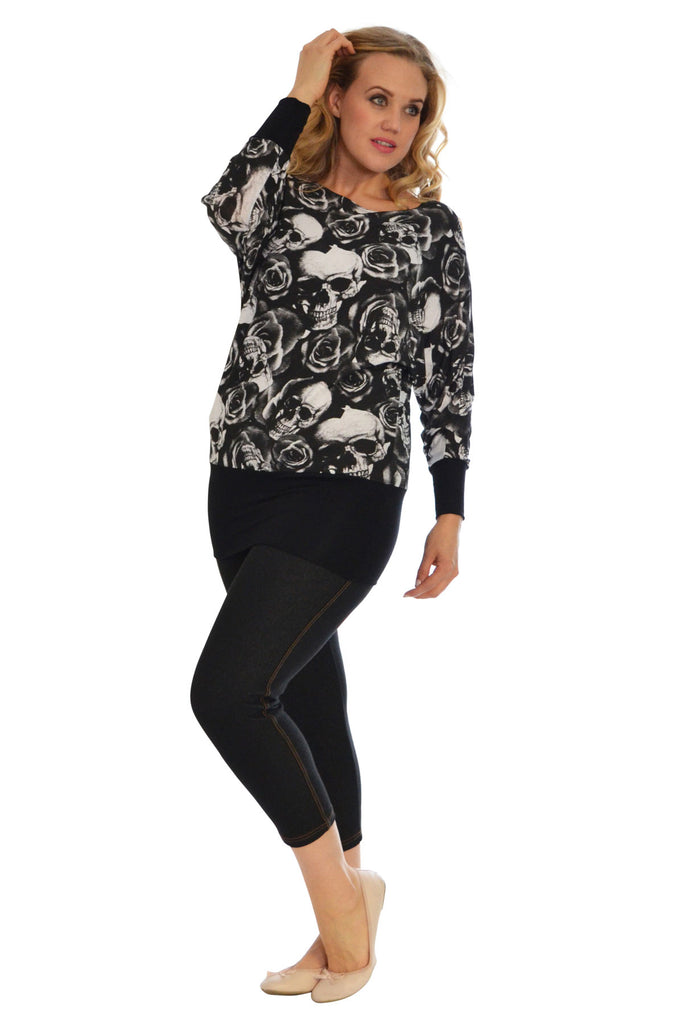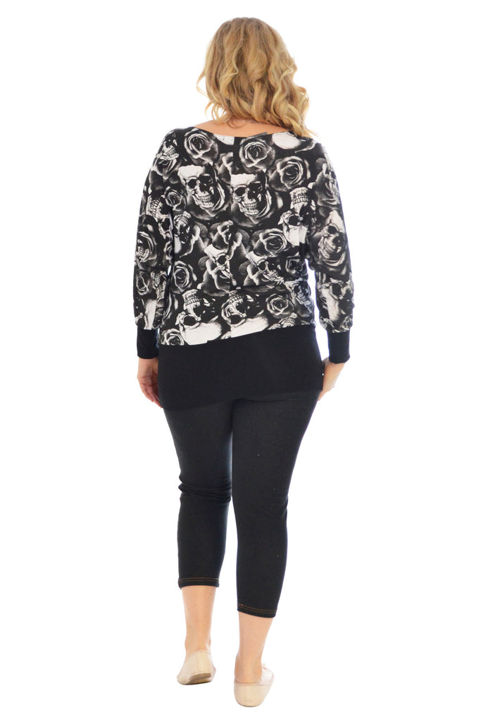 Featuring our bestselling Skull & Roses print, this top delivers attitude with elegance. The batwing silhouette offers effortless drape and movement, while the black waistband defines your shape with comfort and confidence. Designed with long sleeves and a relaxed fit, it’s perfect for pairing with jeggings or leggings for a look that’s as fierce as it is flattering.